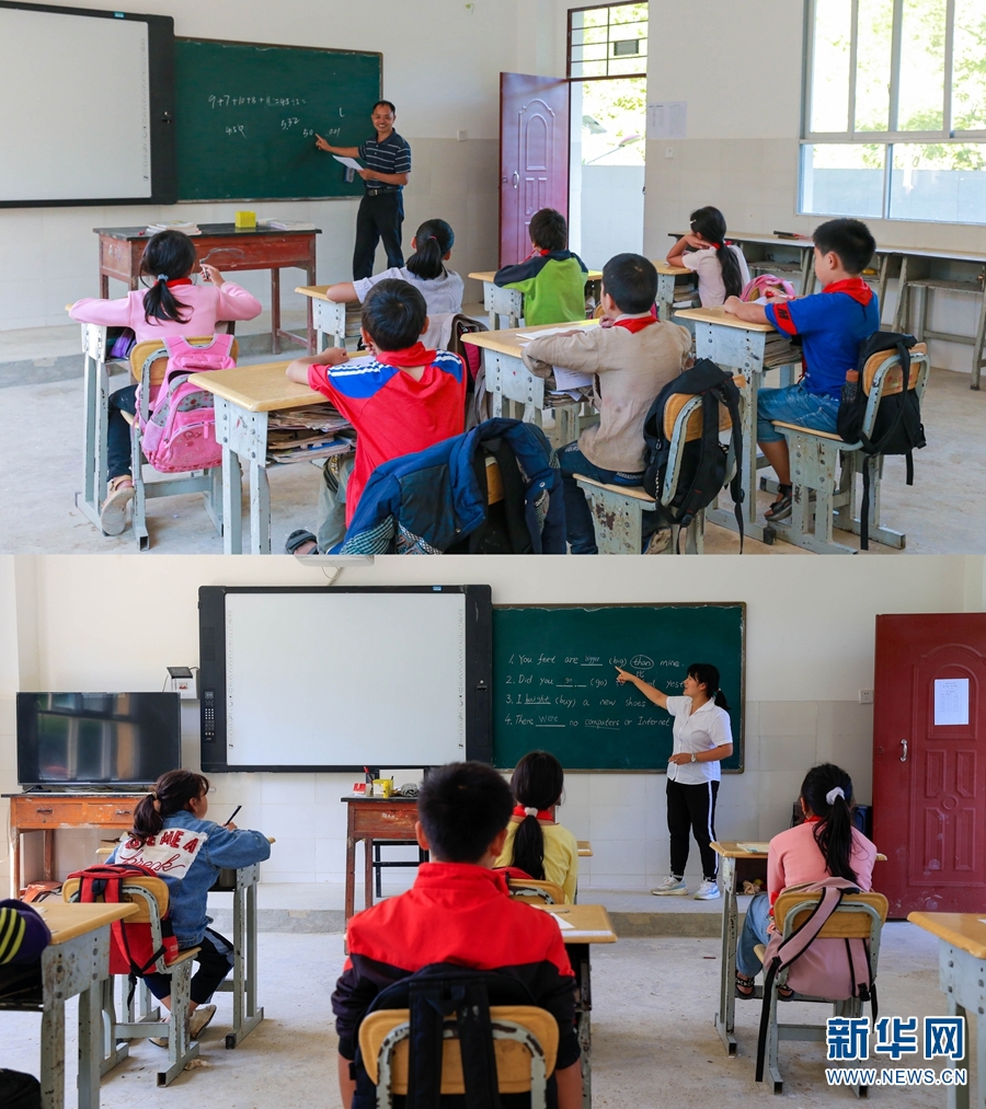 拼版照片:上图为2020年7月24日,农加贵在给学生们上课;下图为2022年7月6日,朱丽丹在给学生们上课。(新华网 赵普凡/摄)