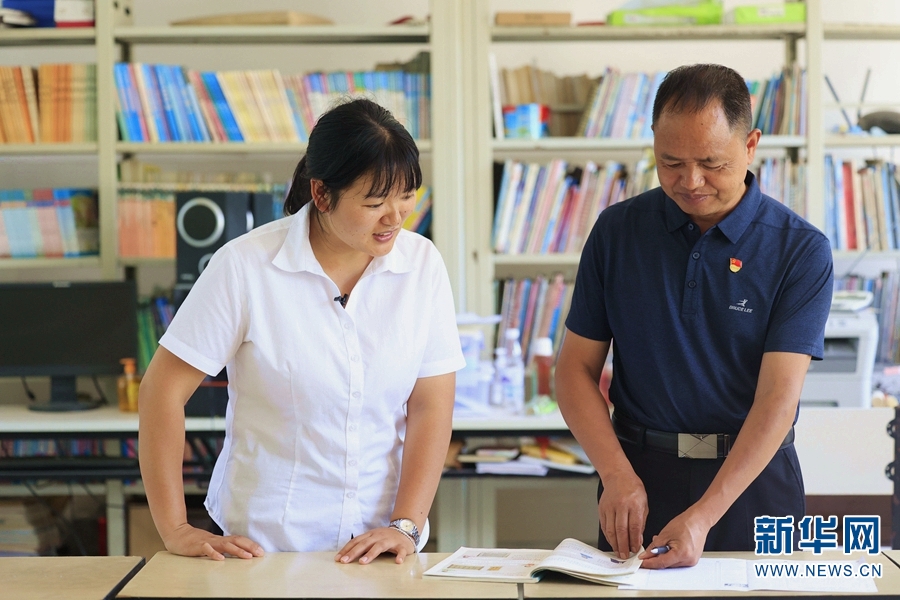 图为农加贵和朱丽丹在讨论教学内容。2020年7月采访农加贵的时候,他已经“一师一校”坚守了34年,当时的他最担心的,就是招不到新的老师、没有年轻人愿意接班。2020年9月,朱丽丹通过特岗教师考试,来到落松地小学(摄于2022年7月7日)。(新华网 赵普凡/摄)