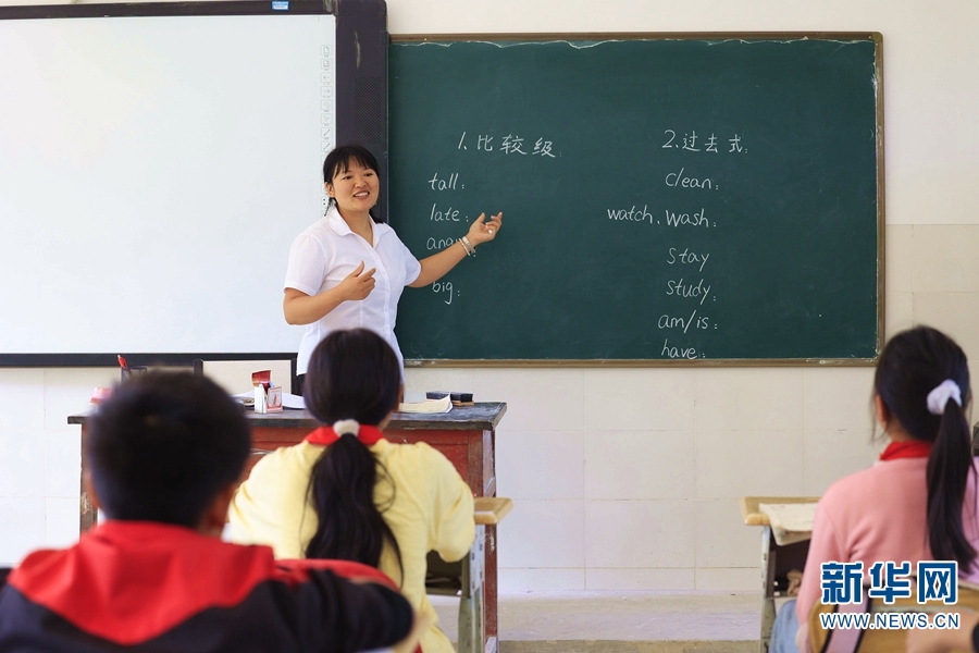 图为朱丽丹在给学生们上英语课。朱丽丹的加入,最让农加贵高兴的,就是补上了他教不了的英语课,学生们再也不用等外校的老师“送教上门”了(摄于2022年7月6日)。(新华网 赵普凡/摄)