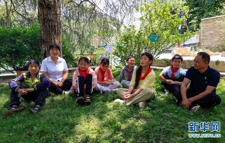 图为课间休息,两位老师和毕业班的学生在草坪上聊天。又一届学生即将走出大山,欣慰的同时,农加贵的内心也充满了不舍,“教了他们6年,陪伴了他们6年,真的很舍不得。但为了他们的前途,为了他们今后的生活过得更好,不得不分别。希望他们越走越远,越飞越高!”(摄于2022年7月7日)。(新华网 赵普凡/摄)