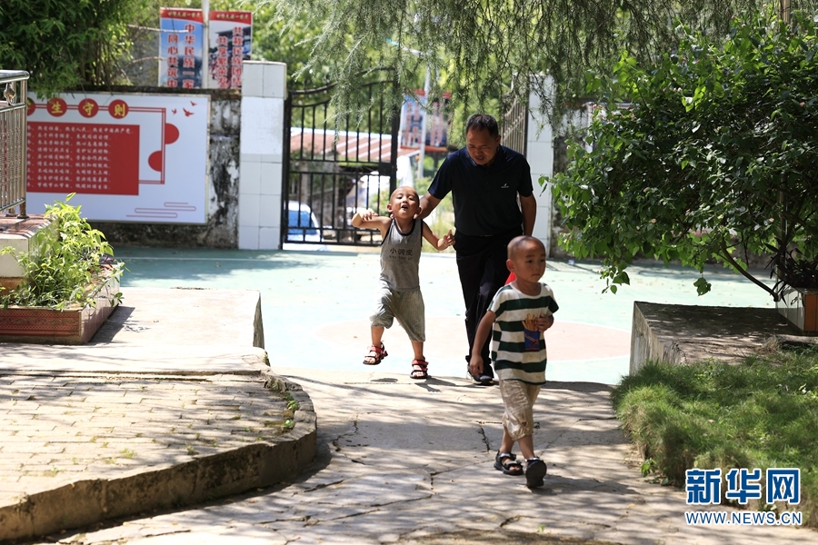 送走毕业生,落松地小学依旧书声琅琅,小班的5名学生,还将继续在这里学习、成长。图为两名调皮的学生,被农加贵“架回”课堂(摄于2022年7月6日)。(新华网 赵普凡/摄)