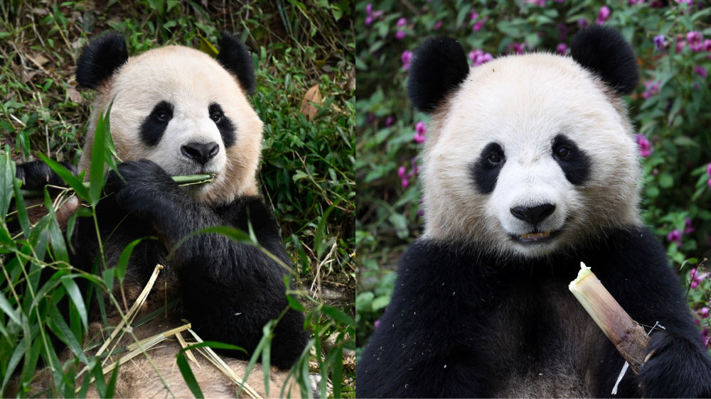 此为拼版图片。10月17日,在中国大熊猫保护研究中心雅安基地,大熊猫“京京”(左)和“四海”在吃竹子。左图新华社记者胥冰洁摄,右图新华社发(陈居伟摄)。