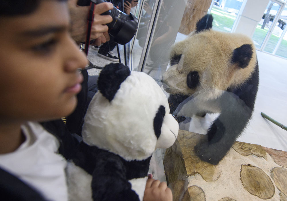 10月19日,在卡塔尔首都多哈的豪尔熊猫馆,人们观看大熊猫。新华社发(尼库摄)