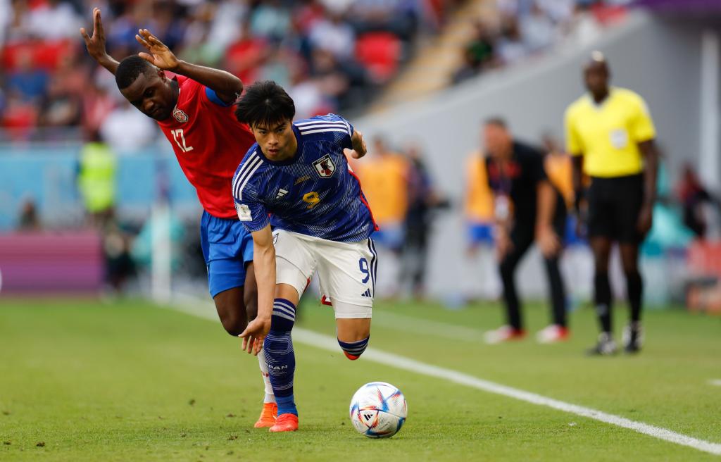 11月27日,日本队球员三笘薰(右)在与哥斯达黎加队的比赛中,他目前效力于英超布莱顿队。新华社记者 王丽莉 摄