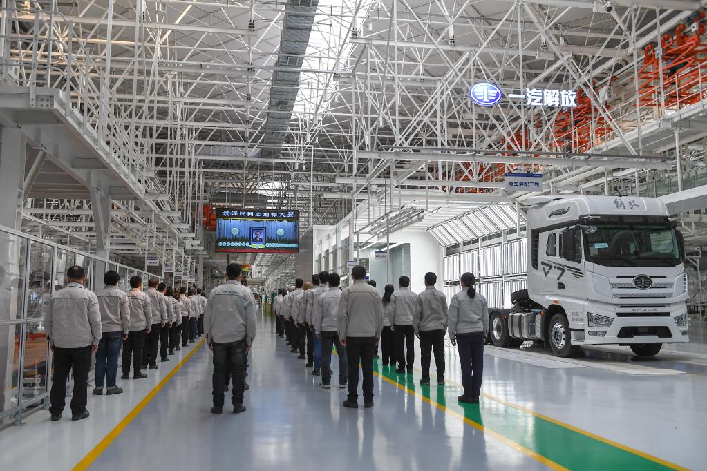 12月6日上午,中共中央、全国人大常委会、国务院、全国政协、中央军委在北京人民大会堂隆重举行江泽民同志追悼大会。举国上下,各族人民沉痛悼念江泽民同志。这是在吉林长春的一汽解放工厂车间,工人们收看江泽民同志追悼大会直播。新华社记者 张楠 摄