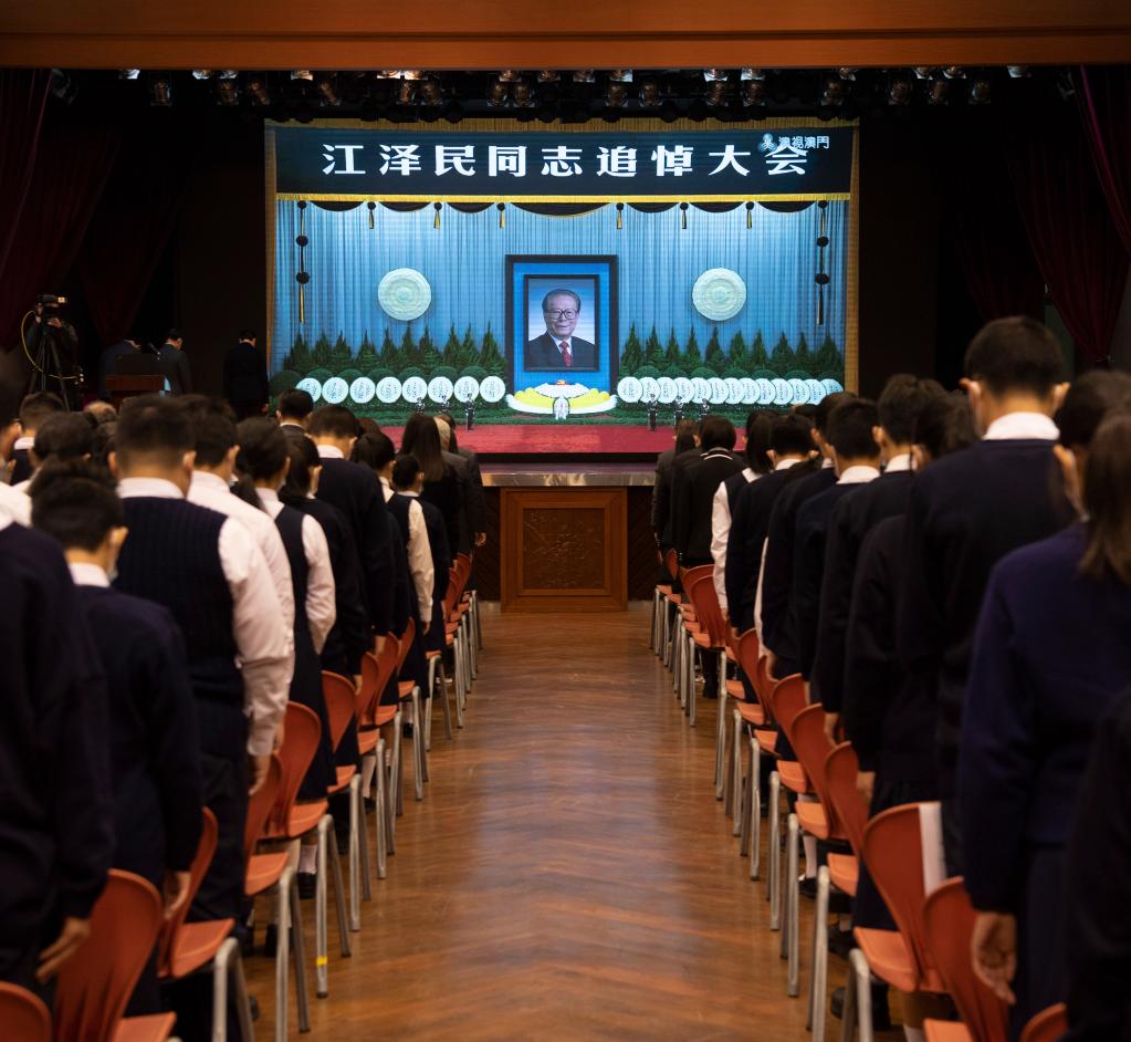 12月6日上午,中共中央、全国人大常委会、国务院、全国政协、中央军委在北京人民大会堂隆重举行江泽民同志追悼大会。举国上下,各族人民沉痛悼念江泽民同志。这是在澳门濠江中学,师生肃立默哀。新华社记者 张金加 摄