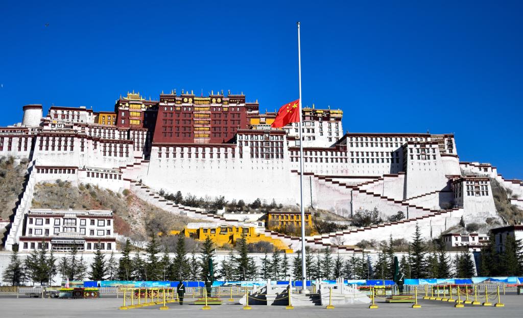 12月6日上午,中共中央、全国人大常委会、国务院、全国政协、中央军委在北京人民大会堂隆重举行江泽民同志追悼大会。举国上下,各族人民沉痛悼念江泽民同志。这是西藏拉萨布达拉宫广场下半旗志哀。新华社记者 张汝锋 摄