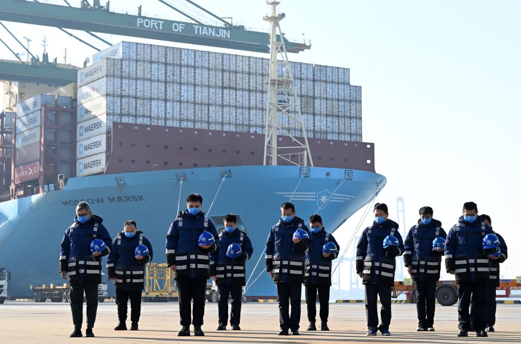 12月6日上午,中共中央、全国人大常委会、国务院、全国政协、中央军委在北京人民大会堂隆重举行江泽民同志追悼大会。举国上下,各族人民沉痛悼念江泽民同志。这是在天津港太平洋国际集装箱码头,职工肃立默哀。新华社记者 赵子硕 摄
