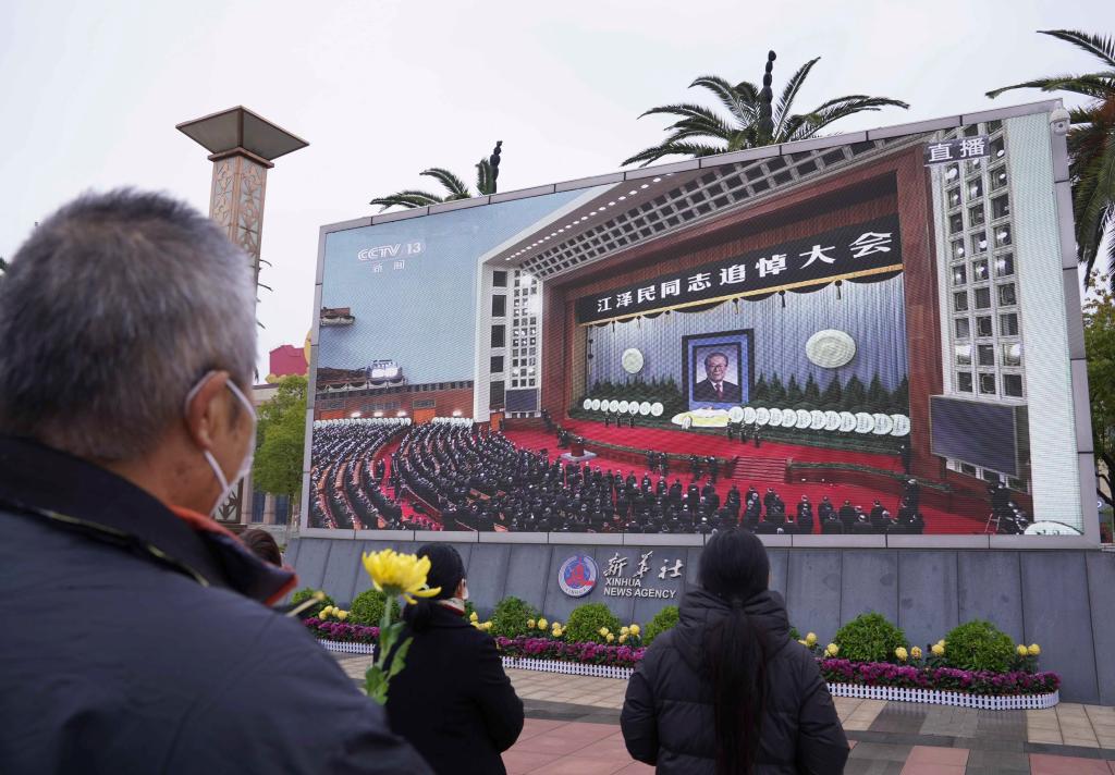 12月6日上午,中共中央、全国人大常委会、国务院、全国政协、中央军委在北京人民大会堂隆重举行江泽民同志追悼大会。举国上下,各族人民沉痛悼念江泽民同志。这是在江西南昌八一广场,群众收看江泽民同志追悼大会直播。新华社记者 周密 摄