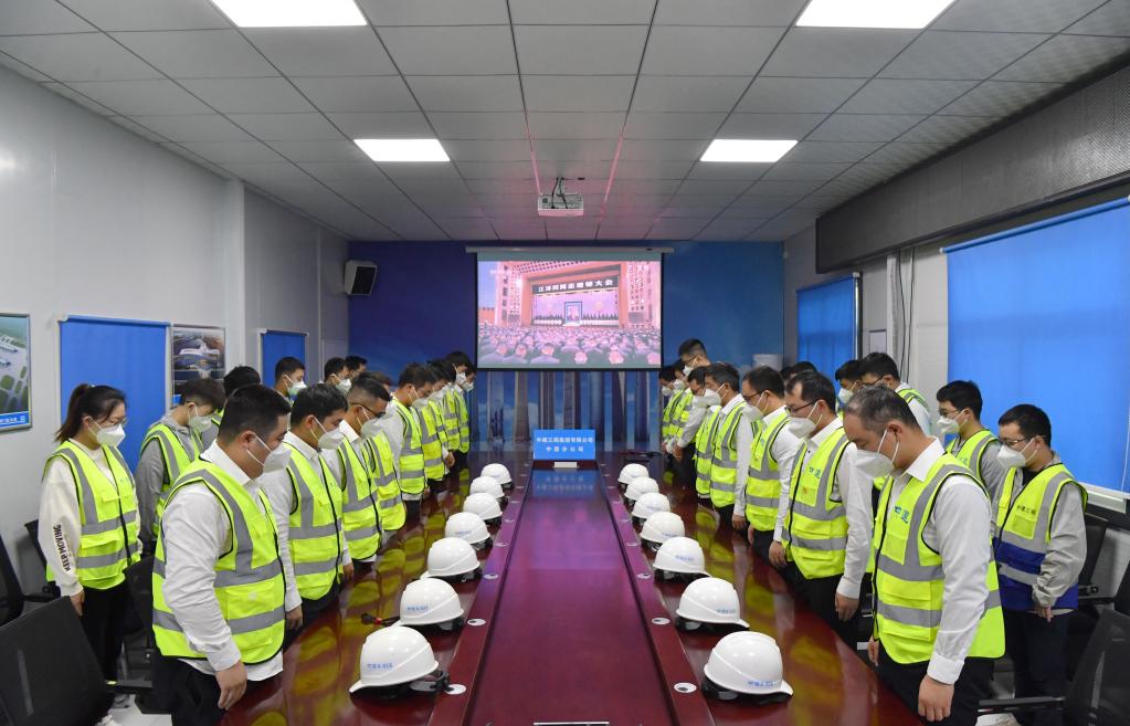 12月6日上午,中共中央、全国人大常委会、国务院、全国政协、中央军委在北京人民大会堂隆重举行江泽民同志追悼大会。举国上下,各族人民沉痛悼念江泽民同志。这是在河南郑州中原数字产业园(西园)项目工地,中建三局的建设者肃立默哀。新华社记者 李嘉南 摄