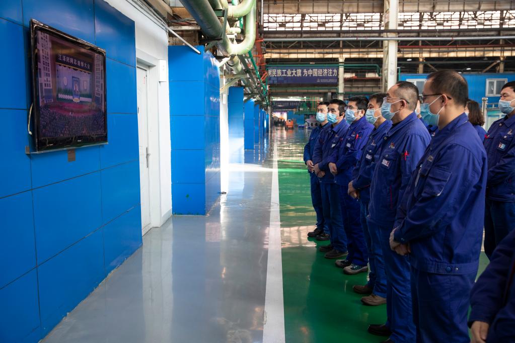 12月6日上午,中共中央、全国人大常委会、国务院、全国政协、中央军委在北京人民大会堂隆重举行江泽民同志追悼大会。举国上下,各族人民沉痛悼念江泽民同志。这是在哈电集团哈尔滨电机厂有限责任公司,职工收看江泽民同志追悼大会直播。新华社记者 张涛 摄