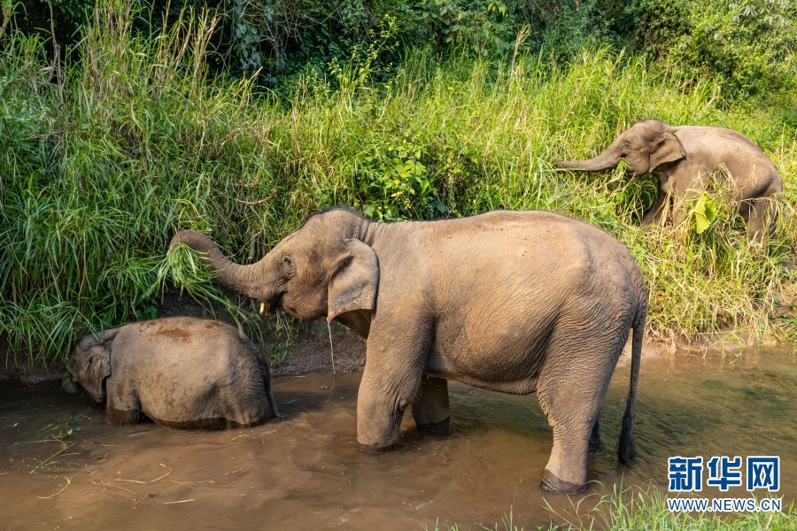 工作人员发现野象谷观象台附近河道的象群中