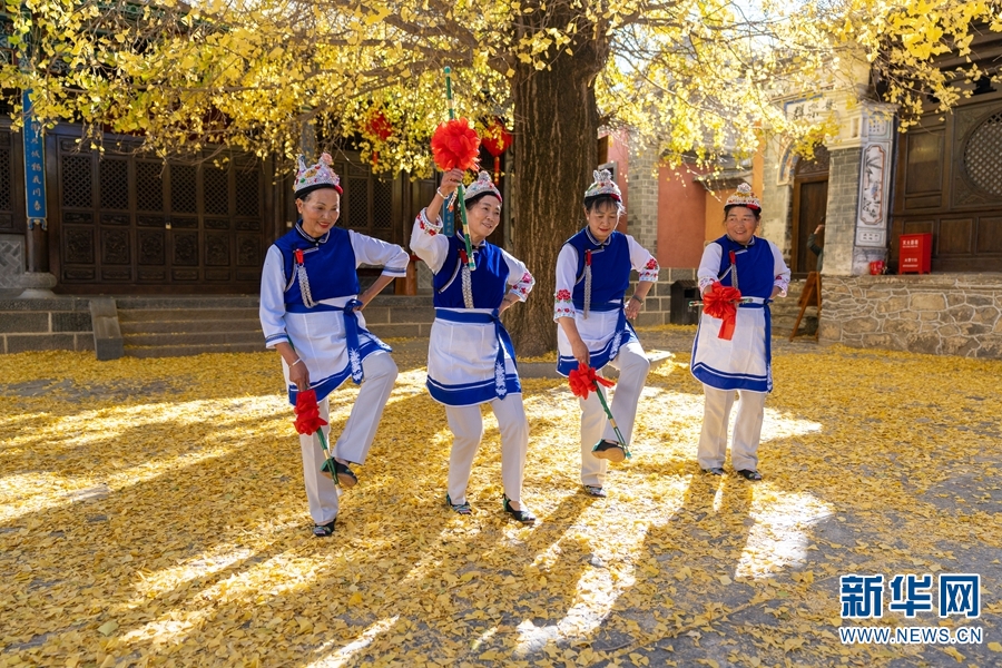 凤翔书院内,4名白族“金花”在练习霸王鞭。新华网发(罗新才 摄)