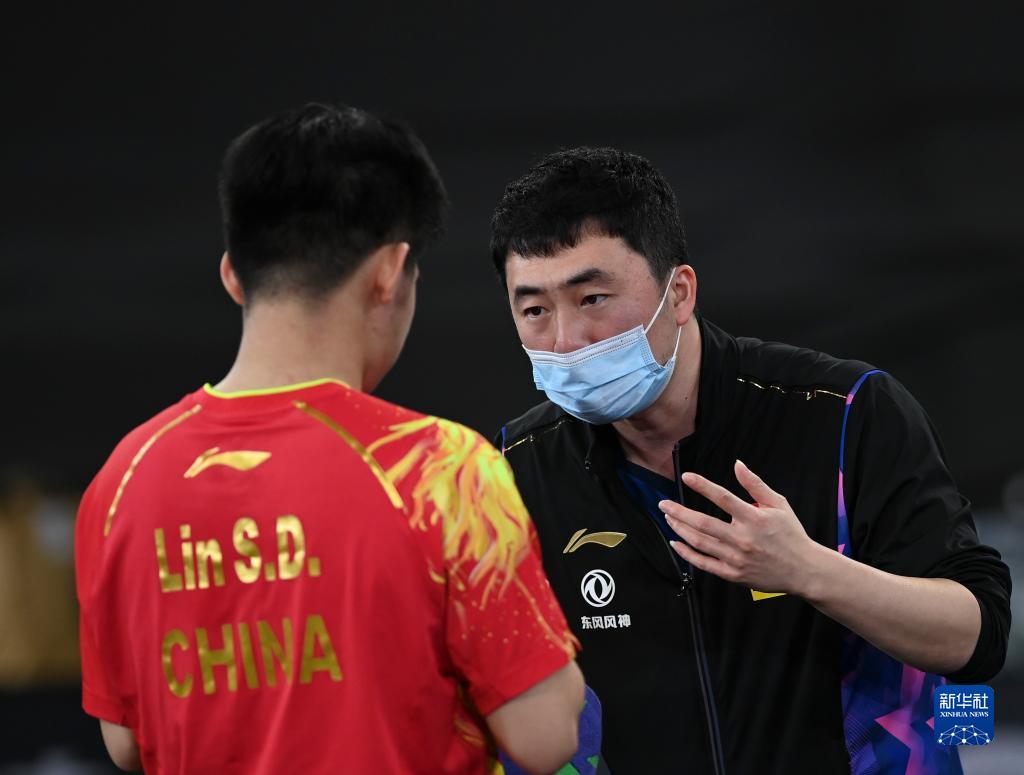 1月20日,教练崔庆磊(右)在比赛间隙指导林诗栋。
