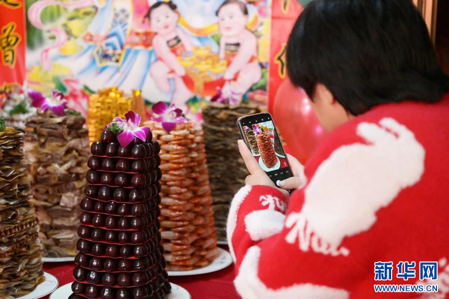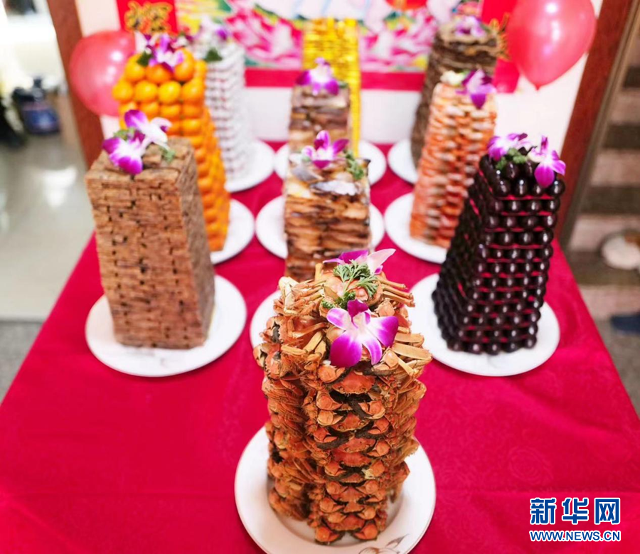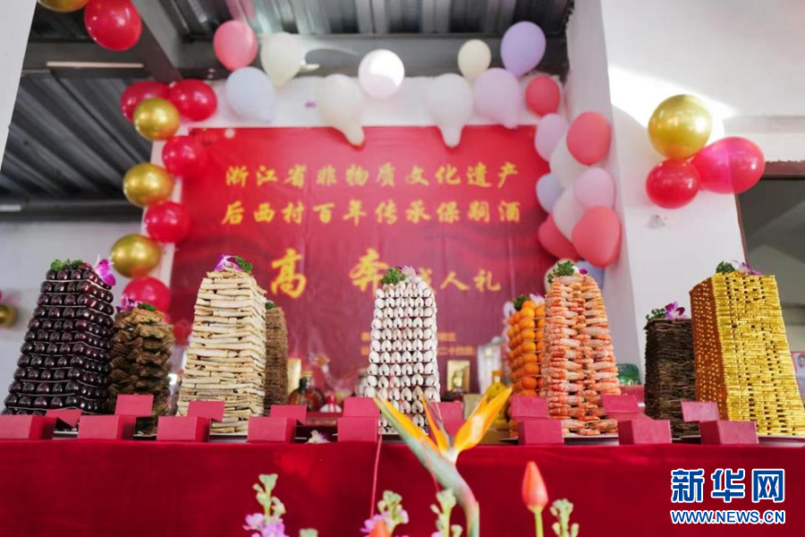 走进乐清市柳市镇新桥文化礼堂保嗣酒暨成人礼集体宣誓仪式现场,由花蛤、虾干、牛肉干、樱桃等食物摆成的十盘层层叠高、状如宝塔的保嗣酒让Delon和Nev频频发出感慨。