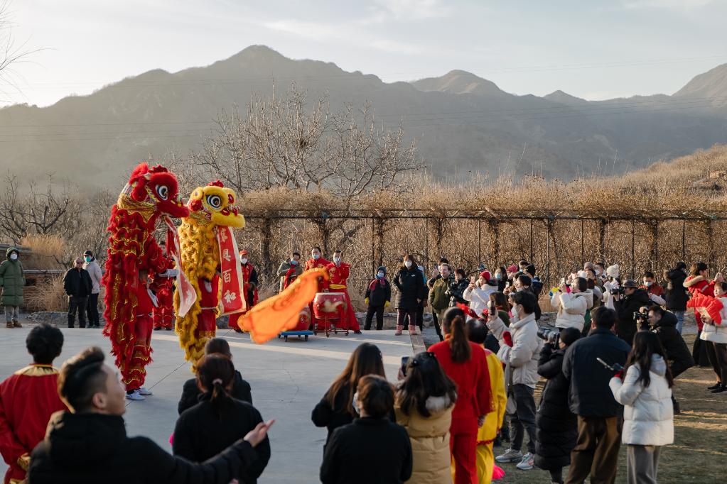 这个春节假期,每到下午4点,慕田峪长城脚下便会响起锣鼓音乐声,一场场舞狮和秧歌表演轮番上演。在北京市怀柔区渤海镇北沟村的瓦厂酒店,表演者们身着彩衣盛装,载歌载舞,与游客和村民们互动演出,现场一片欢声笑语。