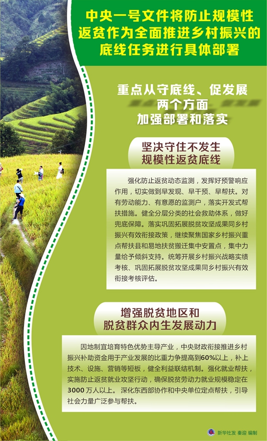 中央一号文件将防止规模性返贫作为全面推进乡村振兴的底线任务进行具体部署。
