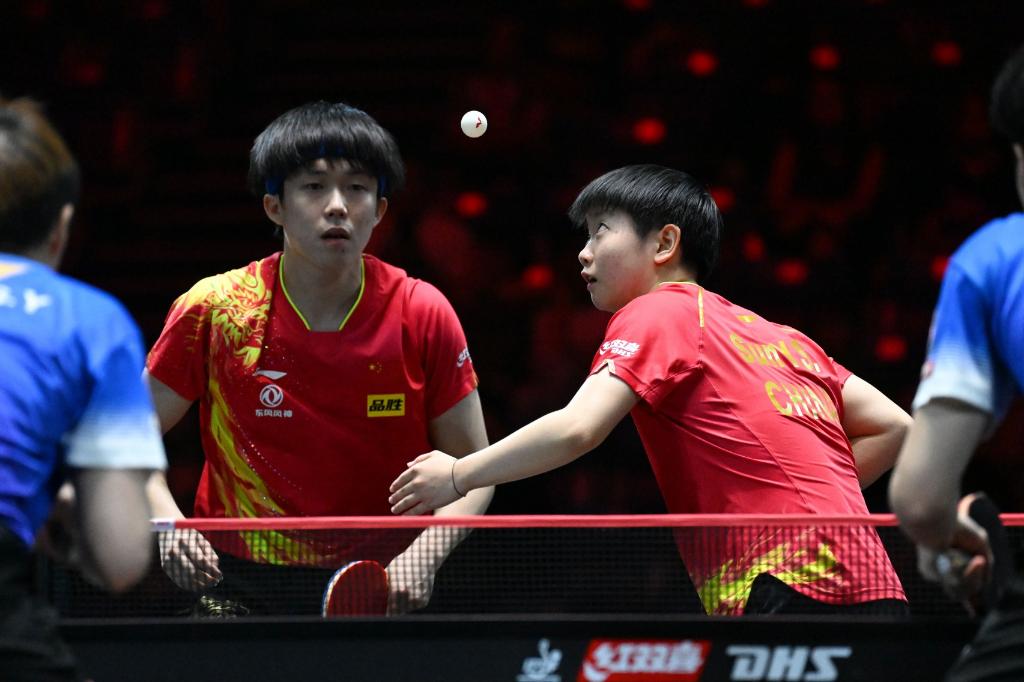 面对中国台北组合林昀儒/陈思羽,混双头号种子王楚钦/孙颖莎以11:5、11:3赢下前两局,在林昀儒/陈思羽11:7扳回一城后,王楚钦/孙颖莎在第四局以11:9锁定胜局。另一场半决赛中,樊振东/王曼昱0:3不敌日本组合张本智和/早田希娜,后者将与王楚钦/孙颖莎争夺冠军。