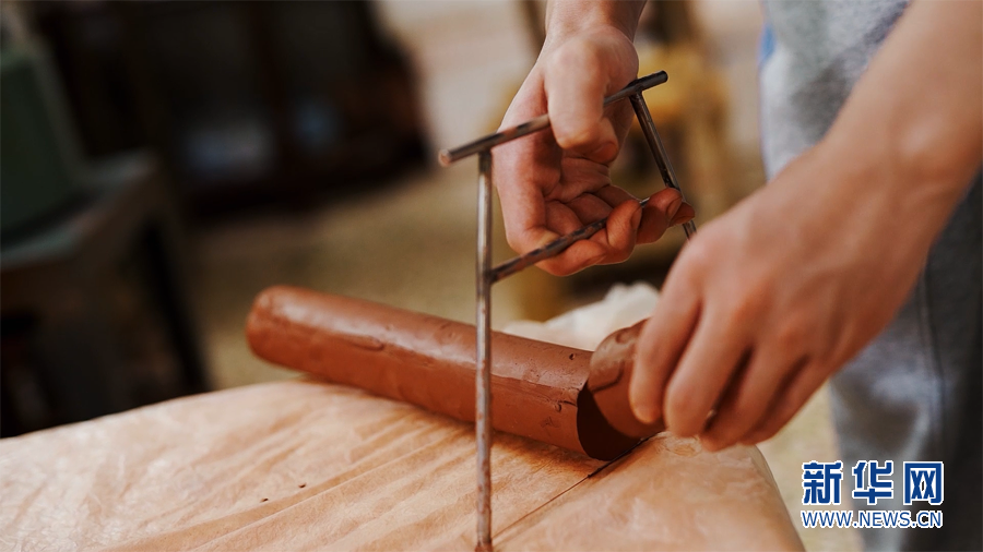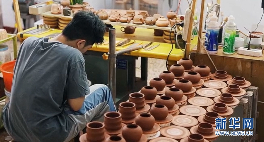 从壶身、壶把、壶嘴到高温烧窑等一系列步骤下来,手艺人需几天时间才能完成一把壶。新华网发(林堉 摄)
