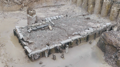 考古发掘为我们还原了当时的港口形制。发掘区西、东两端分别为朔门瓮城及水门外遗迹群,中间跨度达380米的条带状区域中,密集分布着码头、沉船、杆栏式建筑、堤岸等。其中,码头遗址多为多级月台状的突堤式码头。两宋时期的突堤式码头多建于江边滩涂,平面呈长方形,石包土心结构,底部及周缘用木桩打底和围护,以抵御水流冲刷侵蚀,实现软基加固。这一先进技术,显示出古人的智慧。