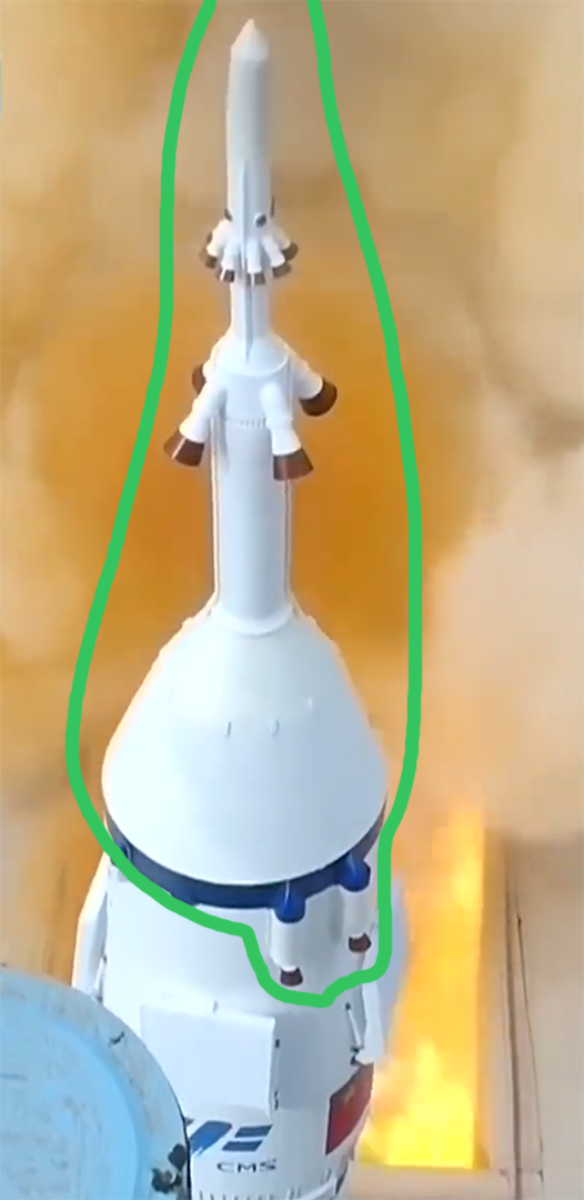 逃逸塔竟然是个小火箭!那它的喷火口在哪儿呢?我们来看看细部。这是神舟十六升空时,发射台拍到的场面。绿色圈出来的是发射逃生系统范围的逃逸塔和整流罩。可以看到逃逸塔的2层喷口,上面8个小的,下面4个大的,都朝着斜下方喷,合力就是向上了。下面的整流罩还可以看到2个喷口。对面还有2个,总共是4个。