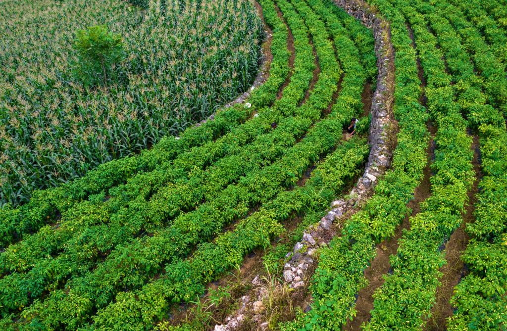 7月27日,一位村民在木者村“摸石谷”中建成的“三保”台地上干农活。新华社记者 杨植森 摄