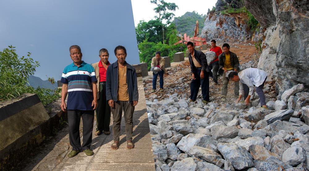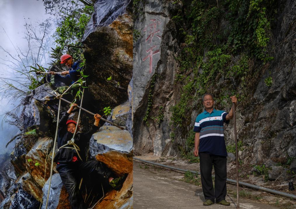 拼版照片:左图为2008年李华明(下)和同伴在修路时在悬崖上打炮眼的资料照片(西畴县融媒体中心供图);右图为2023年李华明在修好的出村路上留影(新华社记者 费茂华 摄)。