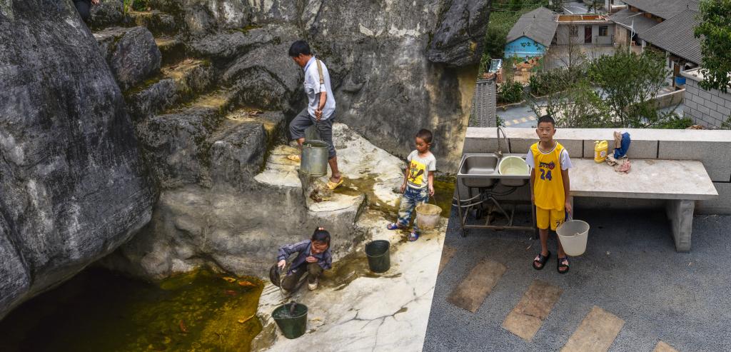 拼版照片:左图为2014年拍摄的西畴县岩头村村民在石头凹里取水,这些水是下雨时积的,当时小村民李大鑫(右)只有5岁(西畴县融媒体中心供图);右图为2023年7月26日拍摄的西畴县岩头村村民李大鑫在自己家的院子里接自来水(新华社记者 费茂华 摄)。