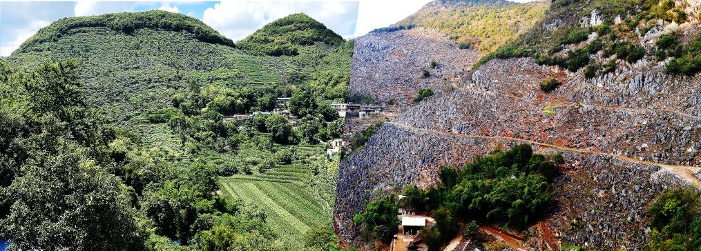 拼版照片:右图为1991年拍摄的西畴县大邬麻村改造前的石漠化情况(西畴县融媒体中心供图);左图为2023年7月26日拍摄的西畴县大邬麻村改造后的情况(新华社记者 费茂华 摄)。