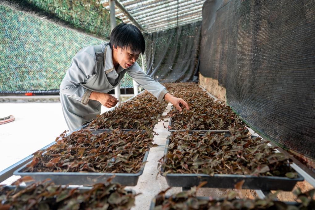 7月27日,工作人员在云南西畴县西洒镇的中药材基地修补遮阳网。新华社记者 吕帅 摄