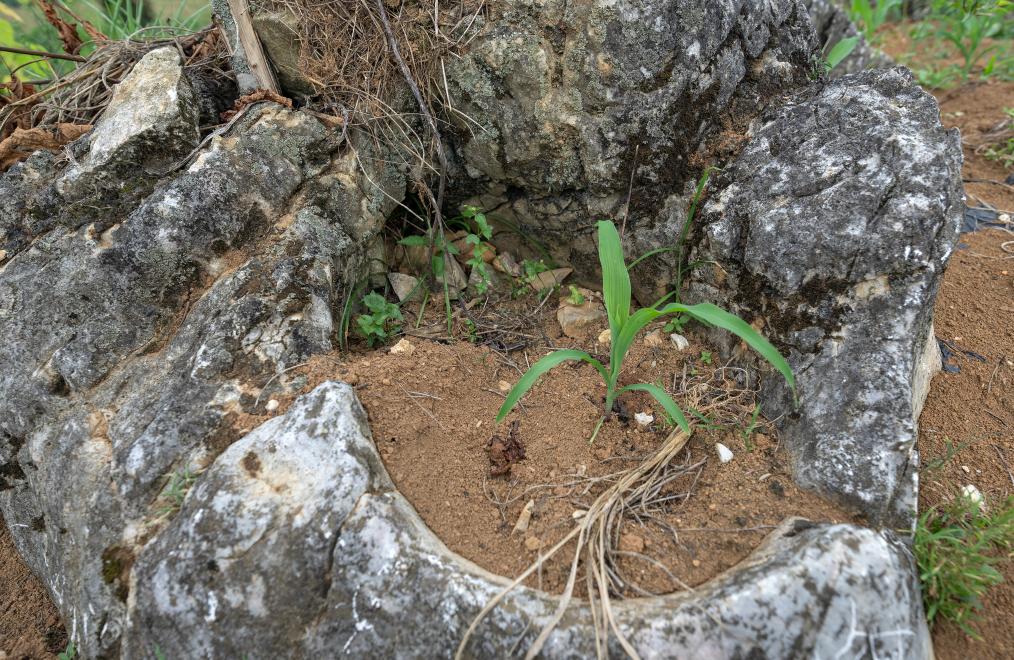 图为2023年7月27日拍摄的一棵种在石头凹里的玉米,西畴县原来的土地大部分都是这样的。新华社记者 费茂华 摄