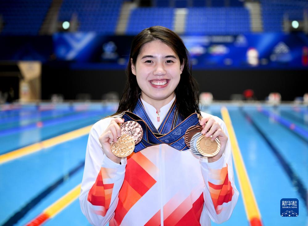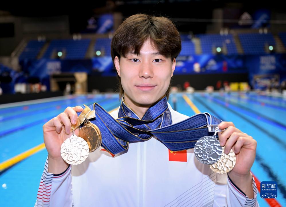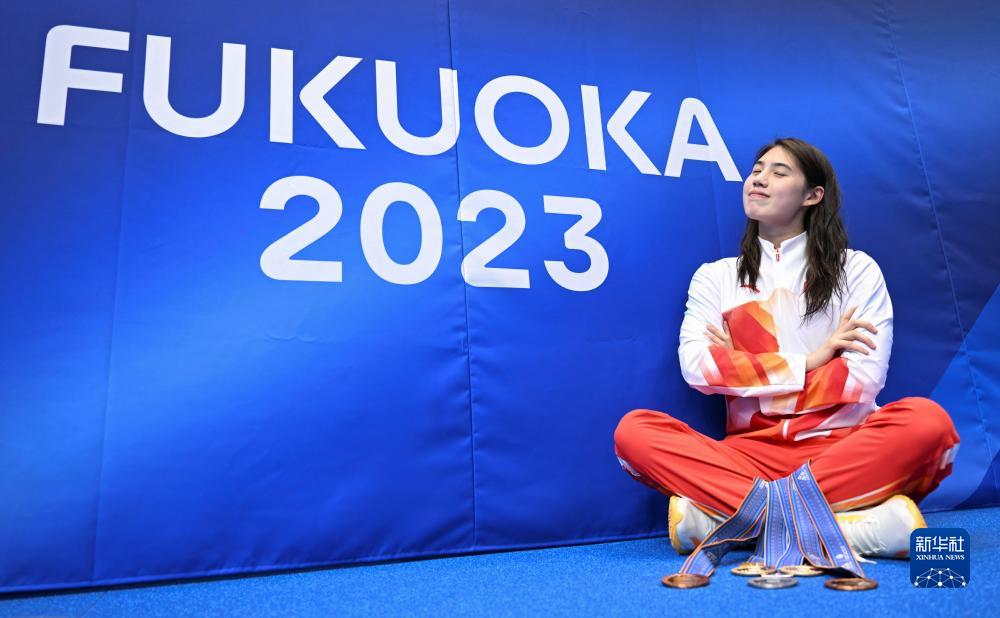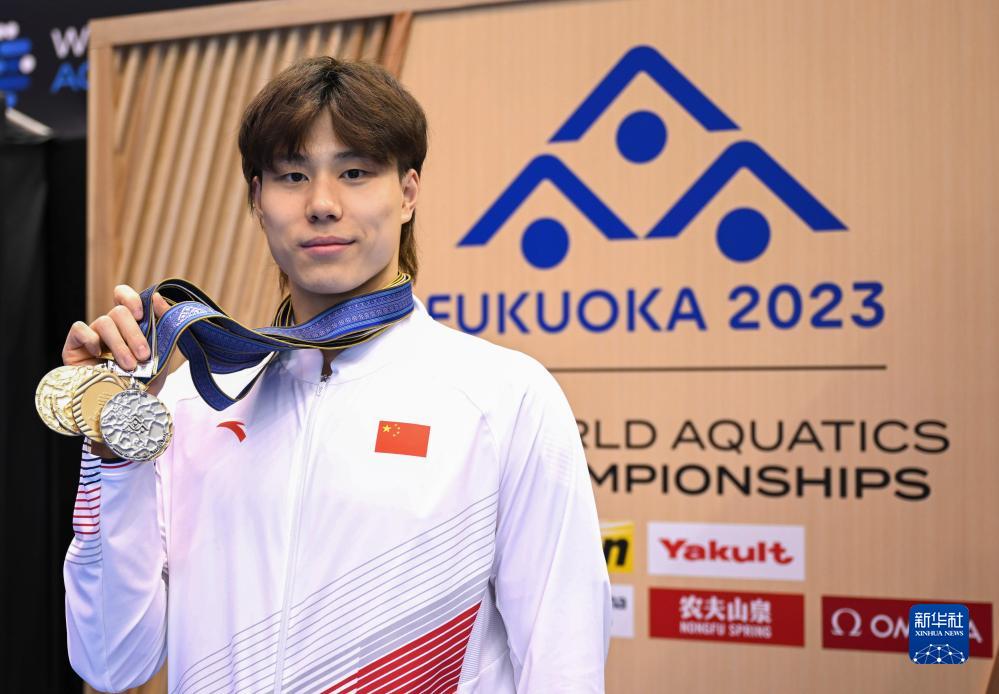 7月30日,覃海洋在赛后与奖牌合影当日,2023年世界游泳锦标赛在日本福冈落下帷幕。新华社记者 夏一方 摄