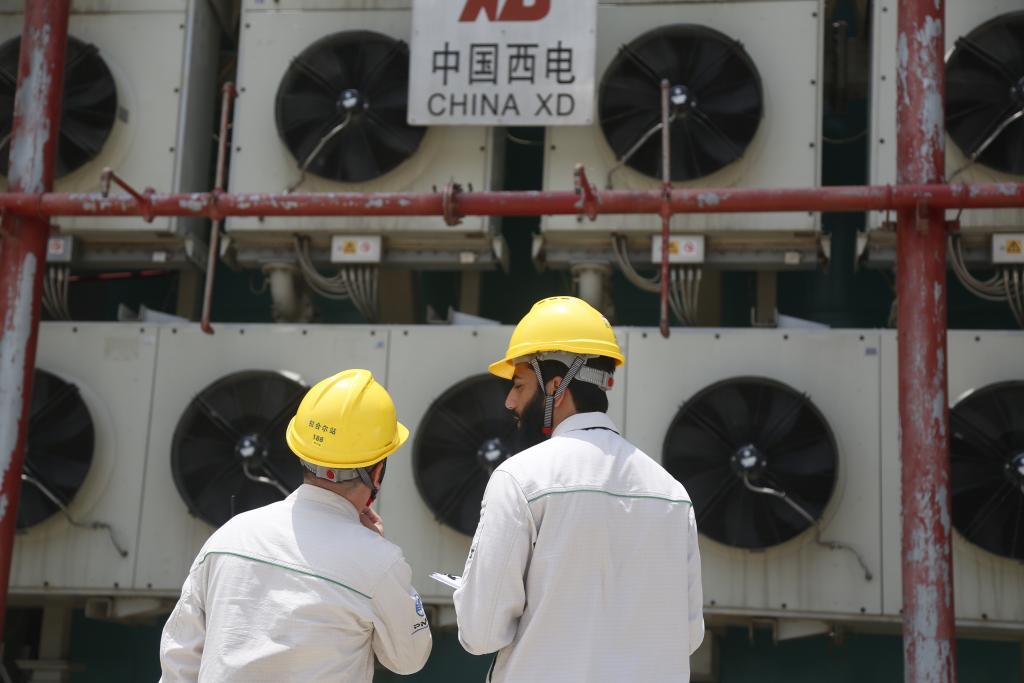 7月4日,巴基斯坦默蒂亚里-拉合尔(默拉)直流输电项目拉合尔换流站中方值班长李守金(左)与巴方值班长祖贝尔·图费勒巡检由中国西电制造生产的换流变压器。新华社发(艾哈迈德·卡迈勒 摄)
