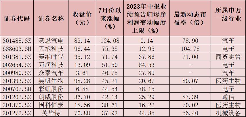 表:7月份以来涨幅居前十的业绩预计增长公司一览