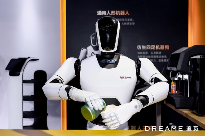 8月16日,追觅通用人形机器人在2023世界机器人大会现场表演咖啡拉花。