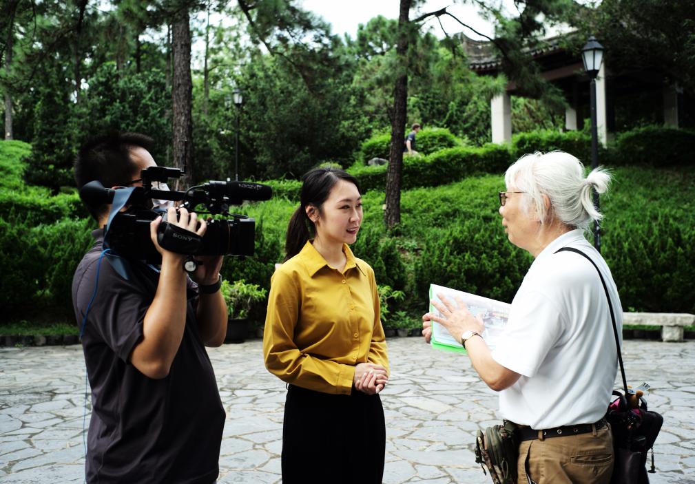在九龙寨城公园,“波叔”吴力波(右)接受记者访问。新华社记者 李钢 摄