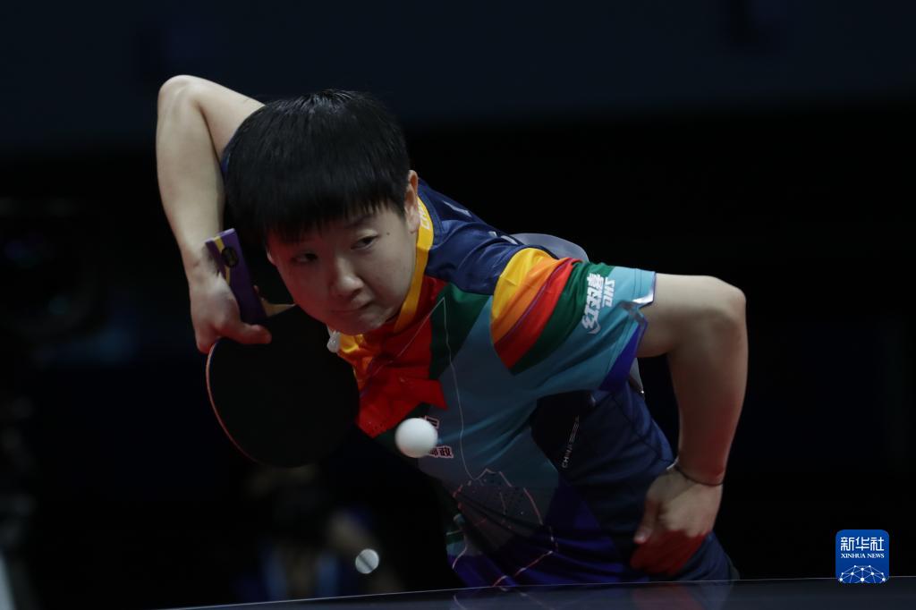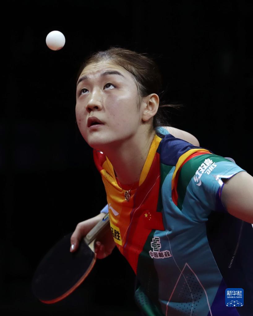 9月5日,中国队选手孙颖莎在比赛中回球。她以3比0战胜韩国队选手申裕斌。新华社发(李相浩摄)