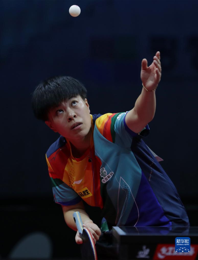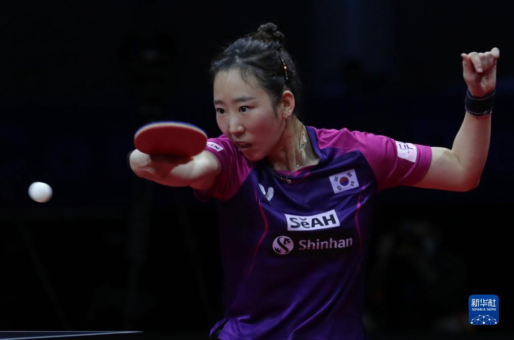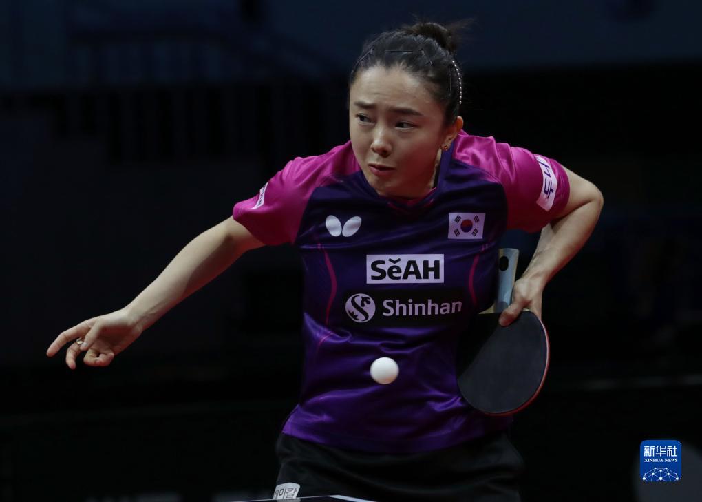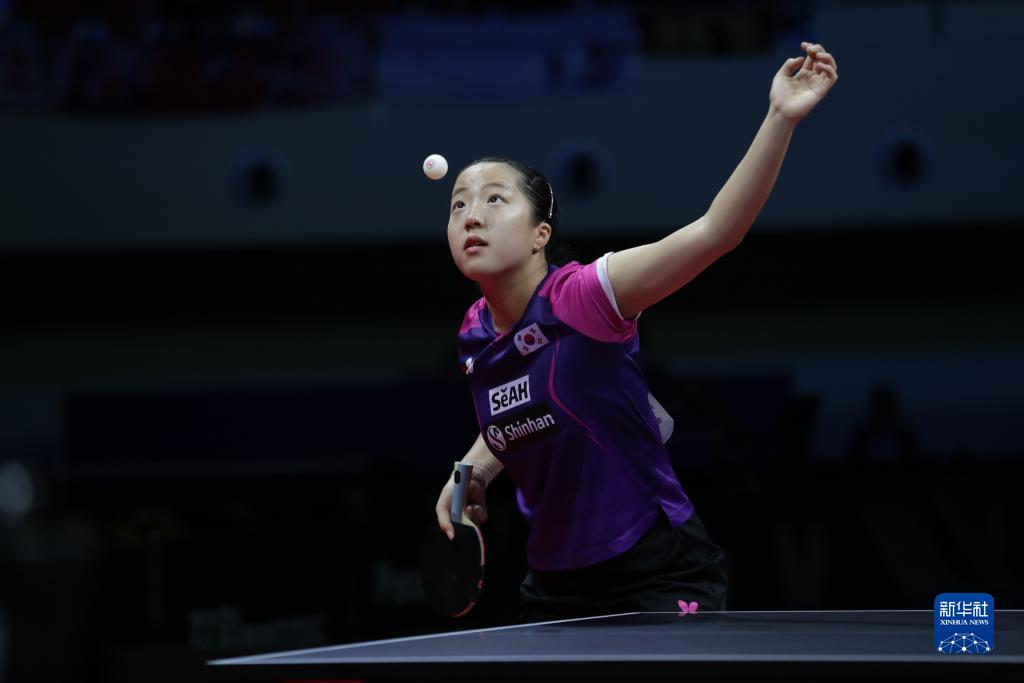 9月5日,韩国队选手申裕斌在比赛中发球。她以0比3不敌中国队选手孙颖莎。新华社发(李相浩摄)