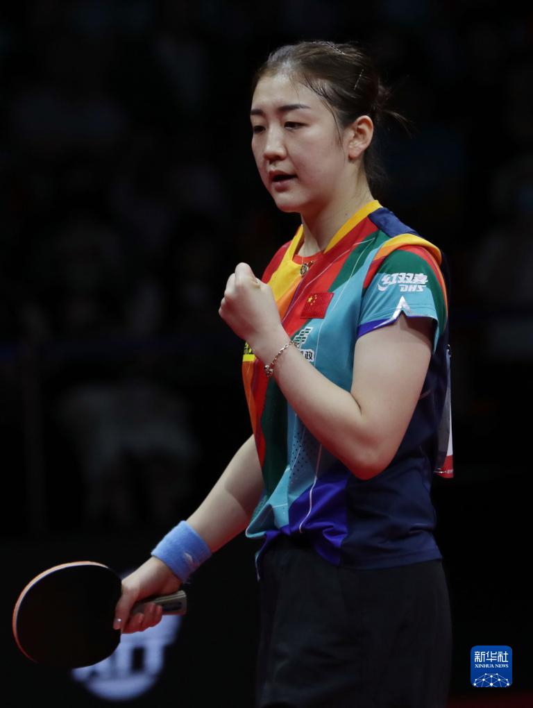 9月5日,中国队选手陈梦在比赛中庆祝得分。她以3比1战胜韩国队选手田志希。新华社发(李相浩摄)
