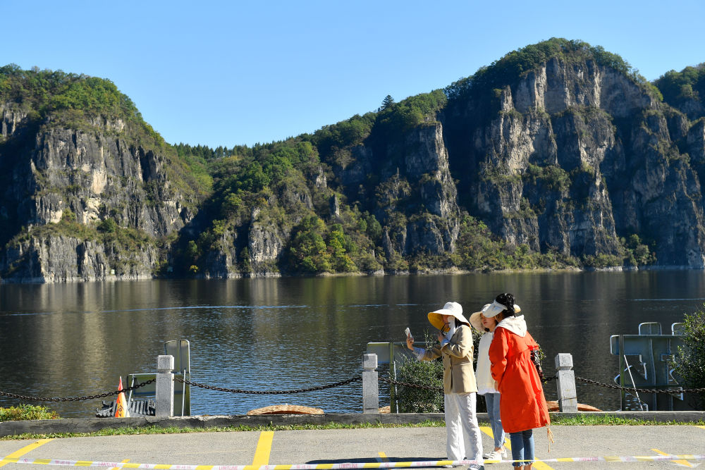2022年9月21日,游人在白山市松花江生态旅游风景区拍照留念。新华社记者 许畅 摄