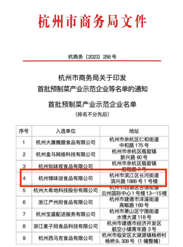 近日,杭州市商务局公布首批杭州市预制菜产业示范企业名单,共9家企业入选,其中包括谦寻旗下自有品牌锋味派。