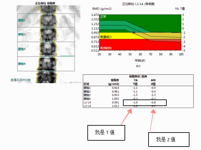案例二:小艾,是广大未绝经年轻女性的代表,因此需要在表格黑框里找数值小的Z值,上图所示Z值是-0.8,Z值>-2.0是正常的,Z值≤-2.0就应该找专业医生咨询。