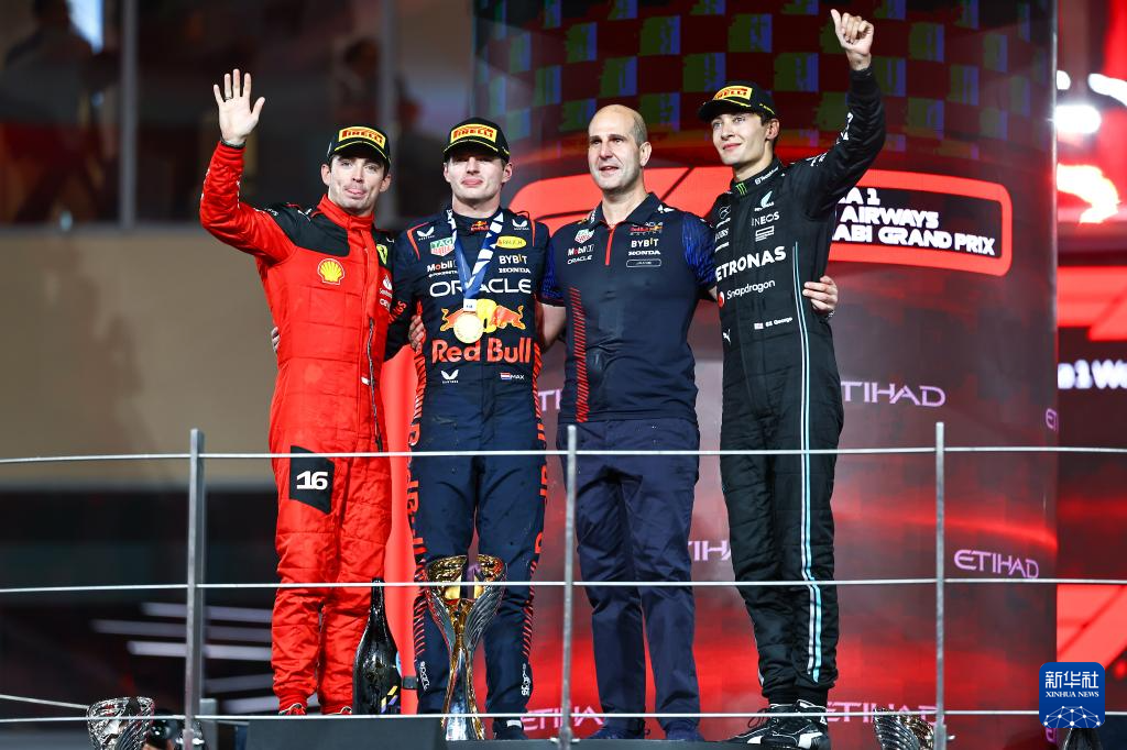 这是2023年11月26日,维斯塔潘(左二)在F1阿布扎比大奖赛领奖台上。新华社发(钱俊摄)
