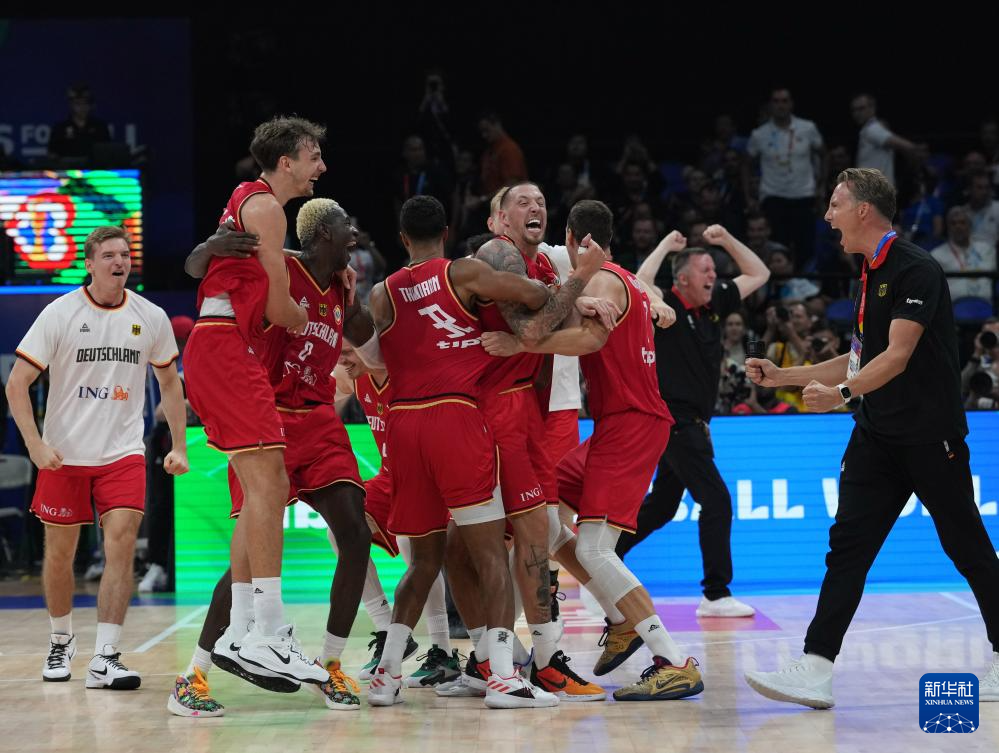 这是2023年9月8日,德国队在篮球世界杯半决赛中庆祝晋级决赛。新华社记者 孟永民 摄