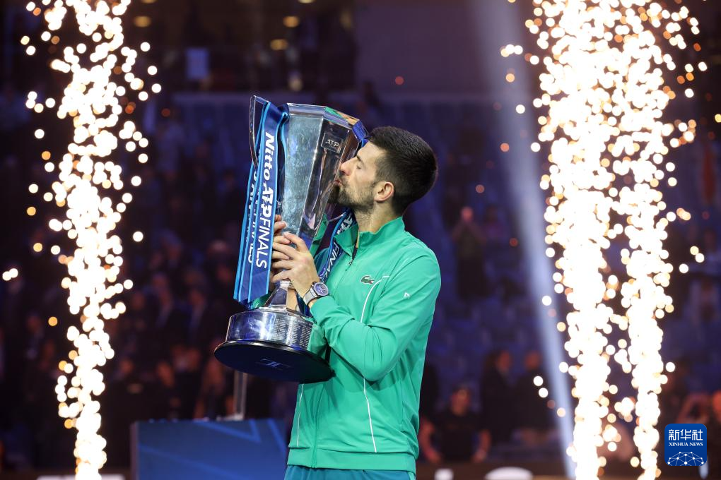 这是2023年11月19日,焦科维奇在颁奖仪式上亲吻ATP年终总决赛冠军奖杯。新华社发(阿尔贝托·林格里亚摄)