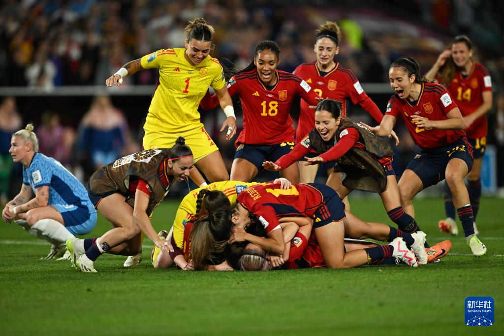 这是2023年8月20日,西班牙队球员在女足世界杯决赛中庆祝夺冠。新华社记者 李一博 摄
