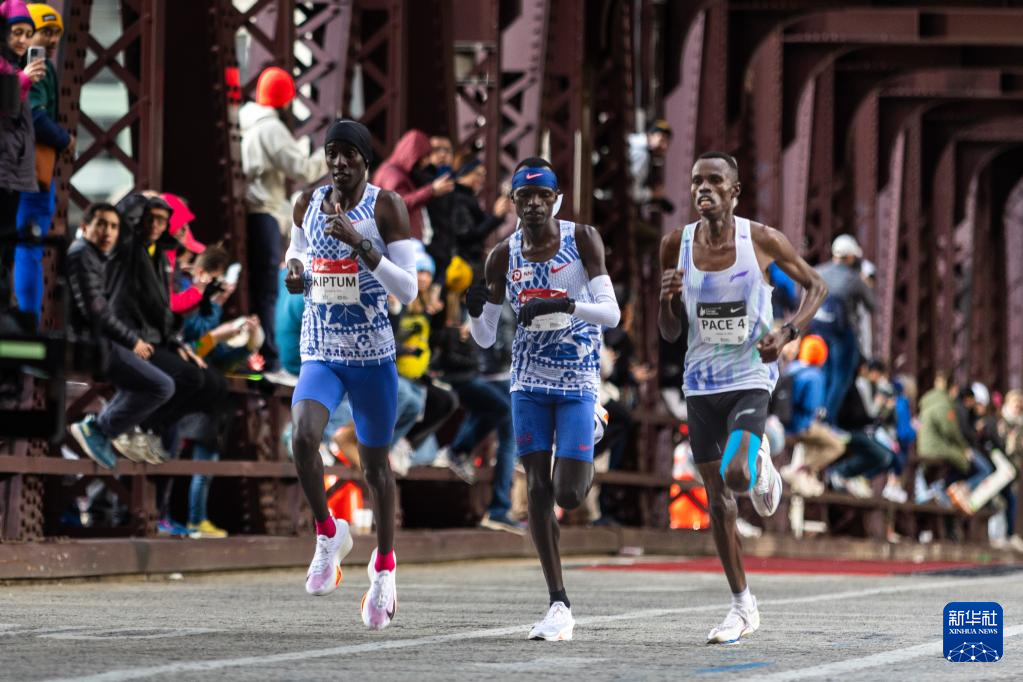 这是2023年10月8日,基普图姆(左)在芝加哥马拉松赛中。新华社发(文森特·约翰逊摄)