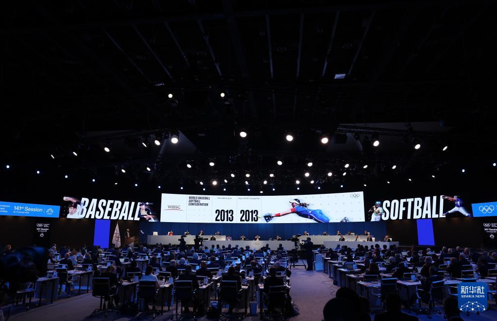 这是2023年10月16日,国际奥委会第141次全会第二日议程会议现场大屏幕展示棒垒球项目。新华社记者 曹灿 摄