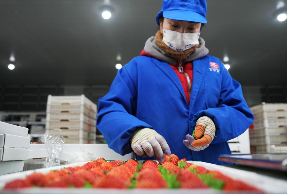 在东港的一处草莓包装车间,工人将草莓装盒(1月9日摄)。新华社记者 李钢 摄