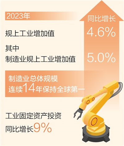 本报北京1月21日电 (记者王政、刘温馨)记者日前从工业和信息化部获悉:2023年,全年规模以上工业增加值同比增长4.6%,较2022年提升1个百分点,其中制造业规模以上工业增加值同比增长5.0%,我国制造业总体规模连续14年保持全球第一。